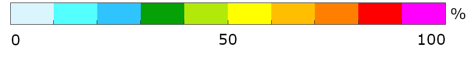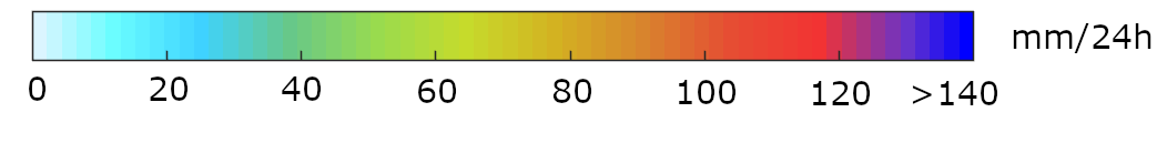 Hier sieht man eine Prognose der Wahrscheinlichkeit, mit der die Niederschlagsmenge der nächsten 24 Stunden einen gewissen Schwellenwert überschreitet. Die Angaben gibt es dabei für drei unterschiedliche Schwellenwerte: 30mm, 50mm und 80mm. Die Überschreitung höherer Schwellenwerte hat eine geringere Wahrscheinlichkeit.